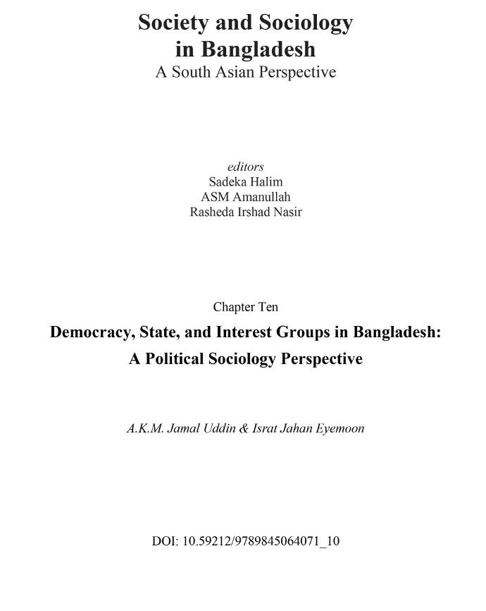 Uddin , A.K.M. Jamal, AU. Democracy, State, and Interest Groups in Bangladesh: A Political Sociology Perspective . Society and Sociology in Bangladesh:  A South Asian Perspective. Dhaka, Bangladesh. https://dx.doi.org/10.59212/9789845064071_10